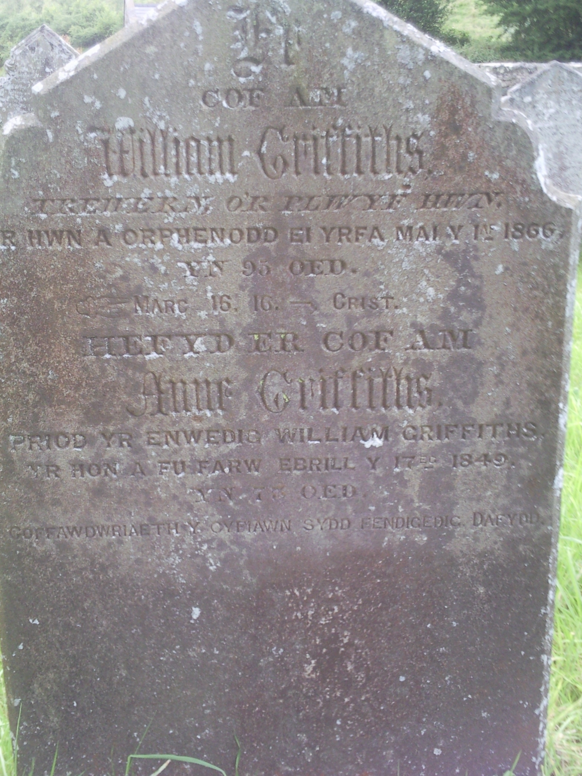 Tragedy struck in the first half of 1866, when the elderly family patriarch William Griffiths passed away on May 1st.  He lived to the remarkable age of 95, especially when taking into account the limitations of medicine available to the poor working classes in the early Victorian age. He was laid to rest at Talley Church and next to his wife Anne.